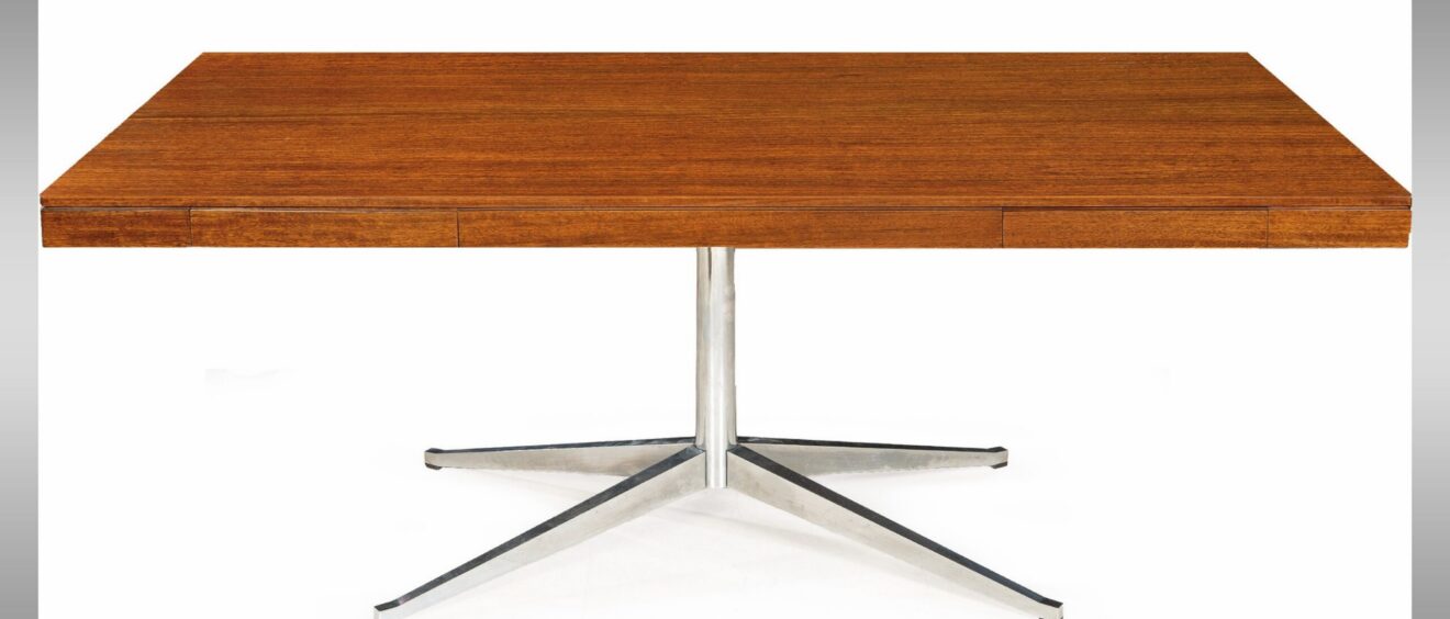 Mesa de despacho ó reunión “Exécutive Partner” de Florence Knoll en caoba. Con dos cajones, pie central con cuatro radios. Hacia 1960 Alto: 74 cm. Largo: 183 cm. Ancho: 95 cm.